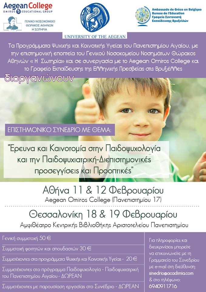 Επιστημονικό συνέδριο με θέμα: «Έρευνα και Καινοτομία στην Παιδοψυχολογία και την Παιδοψυχιατρική-Διεπιστημονικές Προσεγγίσεις και Προοπτικές » , διοργανώνουν τα Προγράμματα Ψυχικής και Κοινοτικής Υγείας του Πανεπιστημίου Αιγαίου , με την επιστημονική εποπτεία του Γενικού Νοσοκομείου Νοσημάτων Θώρακος Αθηνών «Η Σωτηρία», το Γραφείο Εκπαίδευσης της Ελληνικής Πρεσβείας στις Βρυξέλλες και σε συνεργασία με το Aegean Omiros College.