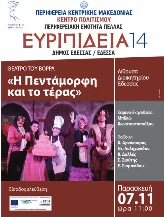 Το κορυφαίο έργο «Η Πεντάμορφη και το Τέρας», από το Θέατρο του Βορρά, παρουσιάζουν η Περιφέρεια Κεντρικής Μακεδονίας, το Κέντρο Πολιτισμού Θεσσαλονίκης της Π.Κ.Μ., η Περιφερειακή Ενότητα Πέλλας και ο Δήμος Έδεσσας, την Παρασκευή 7 Νοεμβρίου 2014 και ώρα 11:00, στην αίθουσα Διοικητηρίου Έδεσσας.