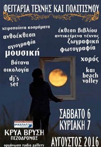 Χειροποίητα κοσμήματα, ανθοέκθεση, έκθεση βιβλίου, ζωγραφικής, φωτογραφίας και αγιογραφίας και αντικείμενα τέχνης θα περιμένουν τους επισκέπτες σε ένα διήμερο πολιτισμού. Και ανάμεσα στην τέχνη βότανα, οικολογία, χορός και μουσική από DJ’s ακόμη και αγώνες beach volley σε μια μεγάλη γιορτή τέχνης, γνώσης, παιδείας και πολιτισμού υπό το φως του καλοκαιρινού φεγγαριού...με ώρα έναρξης το Σάββατο 7μ.μ.
