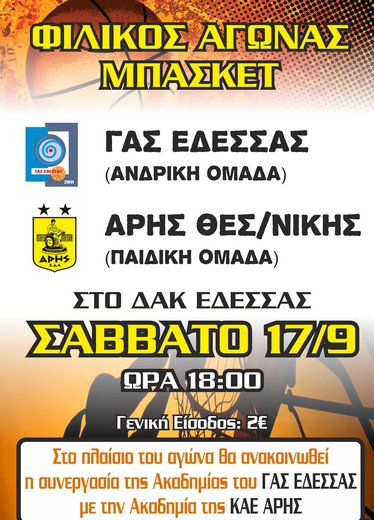 Η παραπάνω συνεργασία θα επικυρωθεί με την φιλική αναμέτρηση ανάμεσα στην Ανδρική ομάδα του ΓΑΣ Έδεσσας με την παιδική ομάδα του Άρη Θεσσαλονίκης. Να σημειώσουμε ότι η παιδική ομάδα του Άρη συμμετείχε στην τελική φάση του Πανελληνίου πρωταθλήματος Παίδων 2016, που έγινε στα Τρίκαλα και κατέλαβε την 4η θέση.