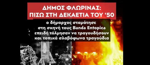 Ένα εξοργιστικό περιστατικό συνέβη πριν λίγες ημέρες κατά τη διάρκεια τοπικής γιορτής στη Φλώρινα, όταν ο δήμαρχος της πόλης σταμάτησε το μουσικό συγκρότημα @Banda Entopica ενώ έπαιζε επειδή ανάμεσα στο ρεπερτόριό του υπήρχαν και τραγούδια της μακεδονικής μουσικής παράδοσης που δεν ήταν ελληνόφωνα!