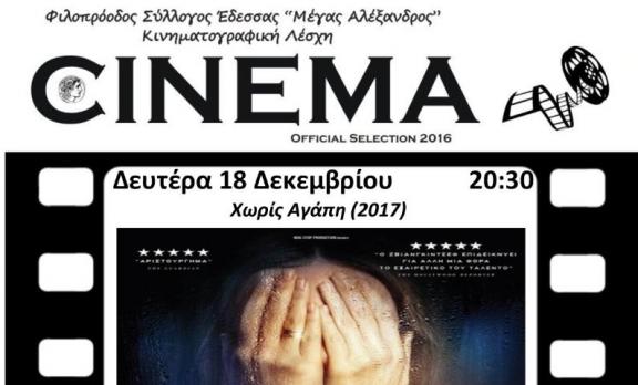 Ο Φ.Σ.Ε. «ΜΕΓΑΣ ΑΛΕΞΑΝΔΡΟΣ» (Κινηματογραφική Λέσχη), με την υποστήριξη της ΔΗ.ΚΕ.ΔΕ., την Δευτέρα 18 Δεκεμβρίου 2017 στις 8:30 μ.μ., στο Πολιτιστικό Κέντρο του Δήμου Έδεσσας (αίθουσα προβολών) θα προβάλλει την ταινία: