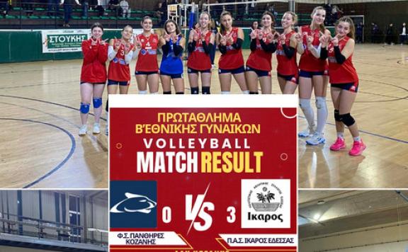 Η ομάδα βόλεϊ ΠΑΣ ΙΚΑΡΟΣ ΕΔΕΣΣΑΣ πέτυχε μια σημαντική εκτός έδρας νίκη 0-3 επί του Φ.Σ. ΠΑΝΘΗΡΕΣ ΚΟΖΑΝΗΣ, στα πλαίσια του πρωταθλήματος Β' Εθνικής Κατηγορίας Γυναικών.