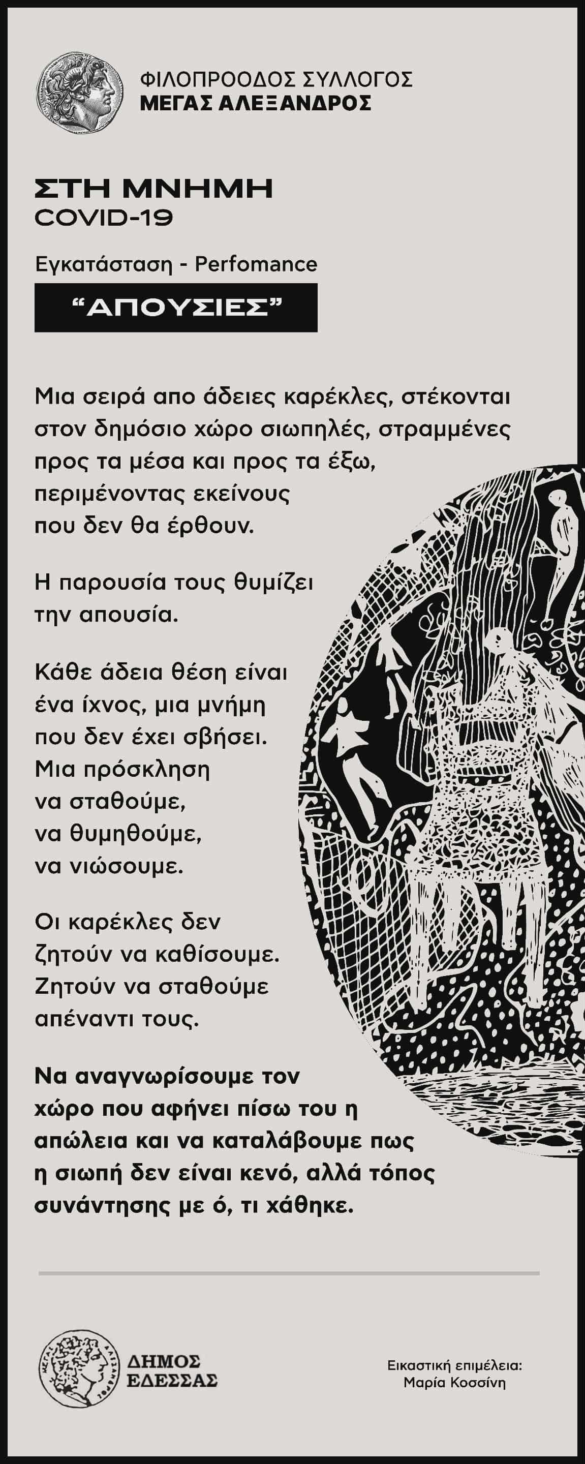 Ο Φιλοπρόοδος Σύλλογος Έδεσσας «Μέγας Αλέξανδρος» σας προσκαλεί την ΚΥΡΙΑΚΗ 7 Δεκεμβρίου 2025, στις 12 το μεσημέρι, στα Μικρά Καταρρακτάκια (Έδεσσα), σε μια ιδιαίτερη εικαστική εγκατάσταση – performance μνήμης με τίτλο «Απουσίες».