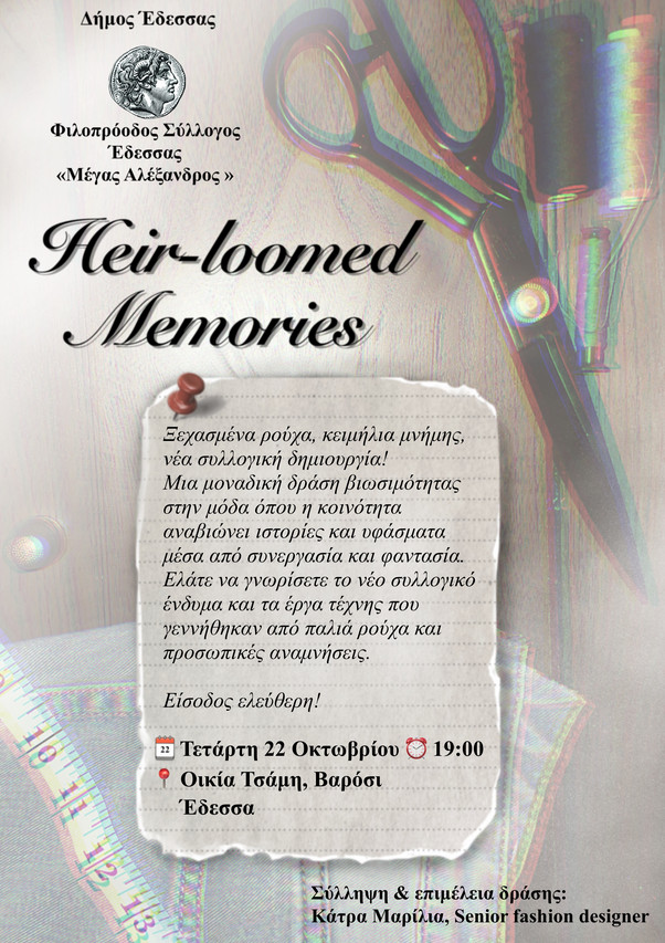 Ο Φιλοπρόοδος Σύλλογος Έδεσσας «Μέγας Αλέξανδρος» διοργανώνει την Τετάρτη 22 Οκτωβρίου 2025 και ώρα 19:00, στην οικία Τσάμη (Βαρόσι) στην Έδεσσα, την παρουσίαση της συμμετοχικής δράσης Heir-loomed Memories, με επιμέλεια και συντονισμό της Μαρίλιας Κάτρα, Senior Fashion Designer.