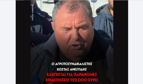 Για παράνομες επιδοτήσεις 122.000 ευρώ ελέγχεται ο αγροτοσυνδικαλιστής του μπλόκου στα Μάλγαρα Κώστας Ανεστίδης