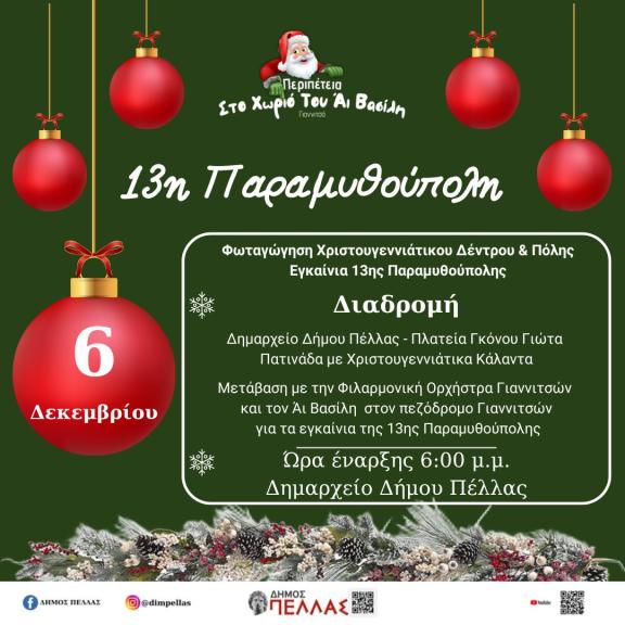 ΓΙΑΝΝΙΤΣΑ : 13η ΠΑΡΑΜΥΘΟΥΠΟΛΗ - ΕΓΚΑΙΝΙΑ ΚΑΙ ΠΡΟΓΡΑΜΜΑ 1ης ΕΒΔΟΜΑΔΟΣ Παρασκευή, 6 Δεκεμβρίου, 2024 - 09:41 ΠΡΟΓΡΑΜΜΑ ΜΕ ΤΑ ΕΓΚΑΙΝΙΑ ΚΑΙ ΤΙΣ ΕΚΔΗΛΩΣΕΙΣ ΓΙΑ ΤΙΣ ΗΜΕΡΟΜΗΝΙΕΣ (6 έως 13 Δεκεμβρίου) ΤΗΣ 13ης ΠΑΡΑΜΥΘΟΥΠΟΛΗΣ ΤΟΥ ΔΗΜΟΥ ΠΕΛΛΑΣ Κατηγορία: Εκδηλώσεις