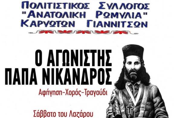 Ο Πολιτιστικός Σύλλογος «Ανατολική Ρωμυλία» Καρυωτών Γιαννιτσών, διοργανώνει επετειακή εκδήλωση αφιερωμένη στον καταγόμενο από την Ανατολική Ρωμυλία, Δάσκαλο και Μακεδονομάχο, Αρχιμανδρίτη Νίκανδρο Παπαϊωάννου, ακολουθώντας την πορεία της ζωής και των αγώνων του, μέσα από αφήγηση, χορό και τραγούδι.