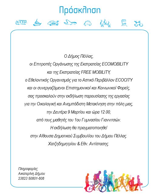 για το Αστικό Περιβάλλον ECOCITY και οι συνεργαζόμενοι Επιστημονικοί και Κοινωνικοί Φορείς, σας προσκαλούν στην εκδήλωση παρουσίασης της εργασίας για την Οικολογική και Ανεμπόδιστη Μετακίνηση στην πόλη μας, την Δευτέρα 9 Μαρτίου και ώρα 12.00, από τους μαθητές του 1ου Γυμνασίου Γιαννιτσών.