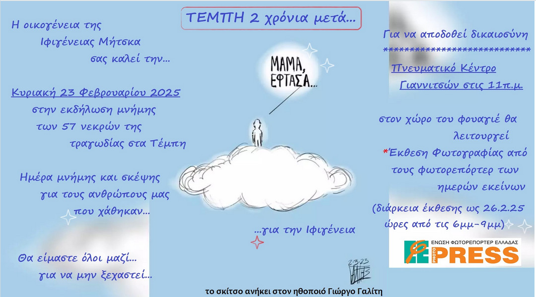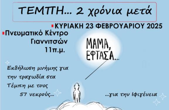 Σε λίγες ημέρες συμπληρώνονται δυο χρόνια από το τραγικό σιδηροδρομικό δυστύχημα στα Τέμπη. Φτάνοντας στην δεύτερη επέτειο μνήμης, η οικογένεια της Ιφιγένειας Μήτσκα διοργανώνει μια εκδήλωση για την 23χρονη κόρη τους, την Κυριακή 23 Φεβρουαρίου στο Πνευματικό Κέντρο Γιαννιτσών στις 11 το πρωί. Με την υποστήριξη όλων και την συμμετοχή ομιλητών από τους υπόλοιπους συγγενείς των 57, με τους συμμαθητές της Ιφιγένειας να μιλούν γι' αυτήν, με ένα μοναδικό βίντεο με τις εικόνες όλων των θυμάτων και με την παρουσία όλων των συγγενών, η αίθουσα θα γεμίσει φωνή ελπίδας ότι όλα αυτά τα παιδιά, όλοι αυτοί οι νέοι άνθρωποι θα βρουν δικαίωση...