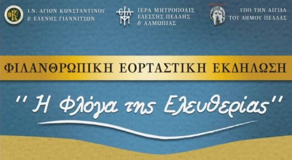 Την Τετάρτη 19 Μαρτίου και ώρα 7:00 μ.μ. στο Πνευματικό Κέντρο Γιαννιτσών η ενορία Αγίων Κωνσταντίνου και Ελένης Γιαννιτσών διοργανώνει υπό την αιγίδα του δήμου Πέλλας φιλανθρωπική εορταστική εκδήλωση με τίτλο: «Η Φλόγα της Ελευθερίας».