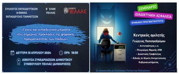 Ο Σύλλογος Εκπαιδευτικών Πρωτοβάθμιας Εκπαίδευσης Γιαννιτσών σε συνεργασία με τη Β΄ ΕΛΜΕ Πέλλας και το Δήμο Πέλλας διοργανώνουν σεμινάριο για τη διαδικτυακή ασφάλεια το οποίο απευθύνεται σε γονείς και εκπαιδευτικούς με θέμα: «Γονείς και εκπαιδευτικοί μπροστά στις σημερινές προκλήσεις της ψηφιακής πραγματικότητας των παιδιών»