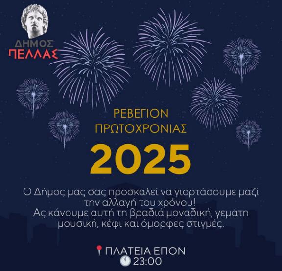 Έτσι ο δήμαρχος Πέλλας Στάθης Φουντουκίδης σας καλεί όλους στην υποδοχή του νέου έτους, σε μεγάλη και λαμπερή εκδήλωση, στην εξέδρα της «Παραμυθούπολης», το βράδυ της Παραμονής Πρωτοχρονιάς. Να είμαστε όλοι εκεί, από τις 10 μ.μ., να χορέψουμε, να γελάσουμε, να τραγουδήσουμε και να συνοδεύσουμε τους καλλιτέχνες μας, Τέο Τσεχερίδη και Έφη Λαζαρίδου, που υπό την καλλιτεχνική επιμέλεια του Γιώργου Γκαντίδη-DJ Flika έχουν ετοιμάσει ένα μοναδικό πρόγραμμα.