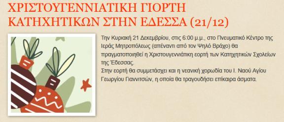 Την Κυριακή 21 Δεκεμβρίου, στις 6:00 μ.μ., στο Πνευματικό Κέντρο της Ιεράς Μητροπόλεως (απέναντι από τον Ψηλό Βράχο) θα πραγματοποιηθεί η Χριστουγεννιάτικη εορτή των Κατηχητικών Σχολείων της Έδεσσας.