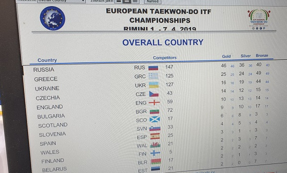 Η Εθνική μας ομάδα ολοκλήρωσε εντυπωσιακά όπως και ξεκίνησε το Ευρωπαϊκό πρωτάθλημα ταε κβο ντό ITF Ανδρών – Γυναικών, Εφήβων – Νεανίδων και Βετεράνων, που έγινε στο Ρίμινι της Ιταλίας. Κατέκτησε την 2η θέση στη Γενική Κατάταξη, μεταξύ 30 χωρών!, κερδίζοντας 25 χρυσά, 24 αργυρά και 49 χάλκινα μετάλλια. Μπροστά της βρέθηκε μόνο η πανίσχυρη Ρωσία και ακολούθησε στην 3η θέση η επίσης πολύ δυνατή Ουκρανία.