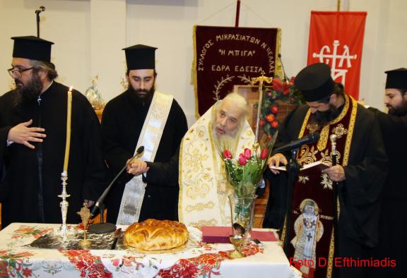 Ο Σεβασμιώτατος Μητροπολίτης Εδέσσης κ. Ιωήλ ευλόγησε τις βασιλόπιτες και στην συνέχεια ο Ιεροκήρυκας της Ι. Μητροπόλεως Αρχιμανδρίτης Παντελεήμων Καραλάζος ομίλησε επίκαιρα. Ακολούθως η χορωδία του Συλλόγου Μικρασιατών «Μπίγα» τραγούδησε επίκαιρα άσματα υπό την διεύθυνση του κ. Στεφάνου Καλιωτάκη, Γραμματέως της Ιεράς Μητροπόλεως. Την εκδήλωση έκλεισε ο Σεβασμιώτατος με τις καθιερωμένες ευχές, ενώ παρουσίασε επίσημα τον νεοχειροτονηθέντα Επίσκοπο Αλμωπίας, κ. Στέφανο.