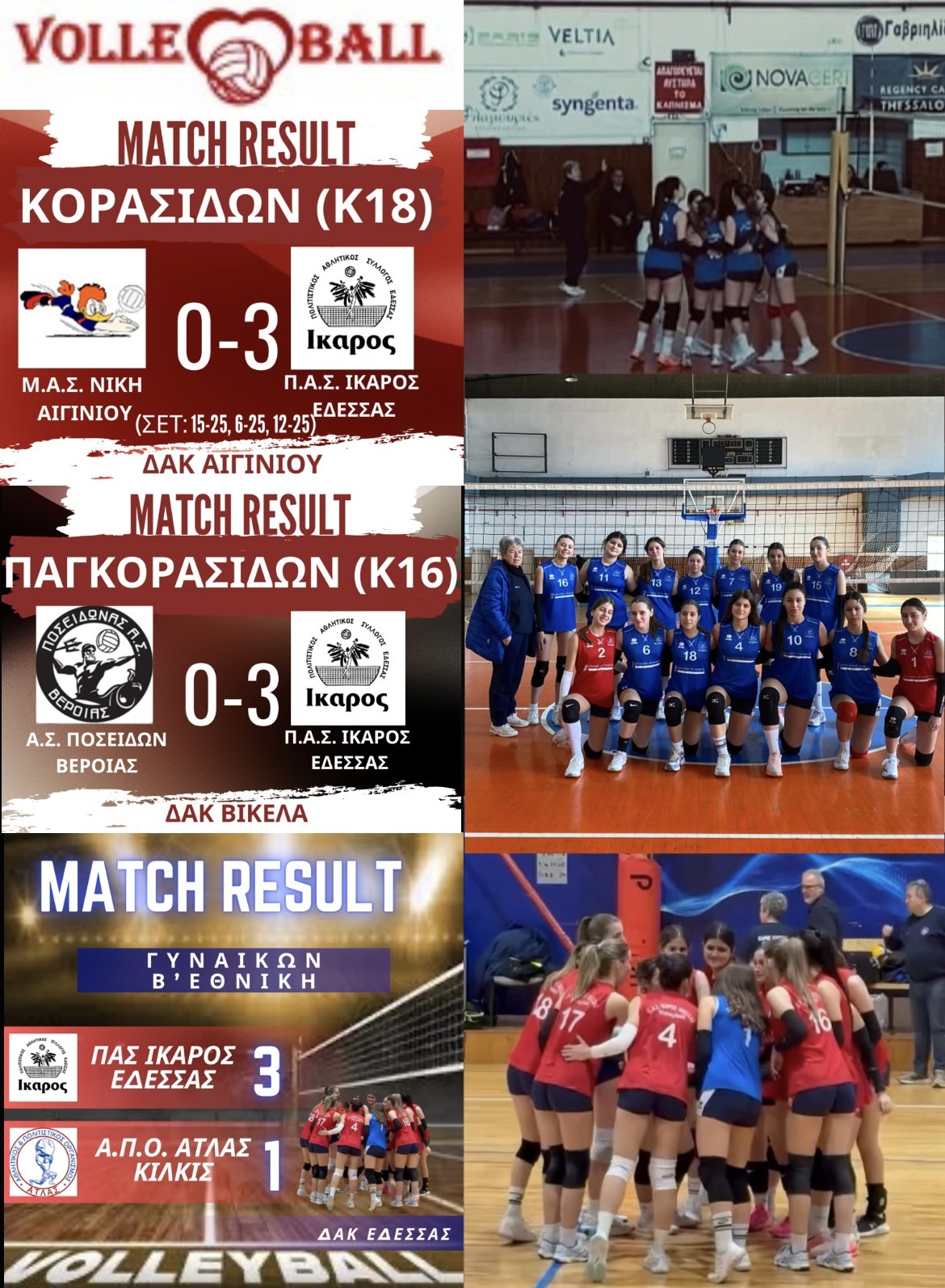 Συνεχίζει την επιτυχημένη πορεία η ομάδα βόλεϊ ΠΑΣ Ίκαρος Έδεσσας, αποδεικνύοντας τη μεθοδική δουλειά που γίνεται στα τμήματα του συλλόγου. Μετά το επιτυχημένο «2 στα 2» της προηγούμενης εβδομάδας, οι αθλήτριές μας πέτυχαν το απόλυτο των νικών το περασμένο Σαββατοκύριακο, σημειώνοντας τρεις νίκες σε ισάριθμους αγώνες.