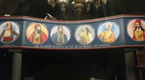 Πρόκειται για την απόφαση του ιερέα της περιοχής να εντάξει στις τοιχογραφίες τα πρόσωπα των ηρώων της Επανάστασης για να έχουν οι νέοι, ως φωτεινά παραδείγματα αυτούς τους «Άγιους» όπως τους χαρακτηρίζει ήρωες, που χωρίς να φοβηθούν, αγωνίστηκαν για την ελευθερία του γένους και του έθνους.