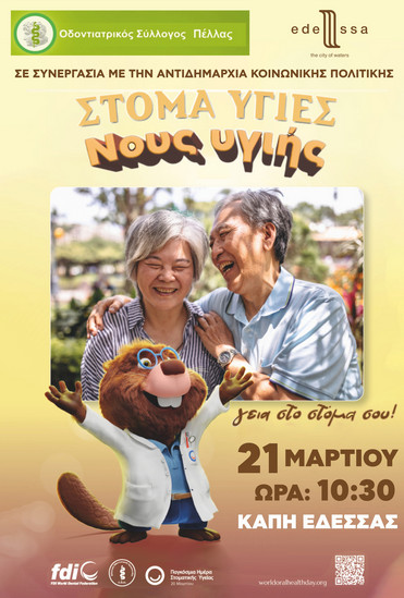 Ο Οδοντιατρικός Σύλλογος Πέλλας σε συνεργασία με την Αντιδημαρχία Κοινωνικής Πολιτικής, με αφορμή την παγκόσμια ημέρα στοματικής υγείας, σας προσκαλούν στην ενημερωτική εκδήλωση με θέμα 'Στόμα Υγειές, Νους Υγιής'' που θα πραγματοποιηθεί στον χώρο του Κ.Α.Π.Η. Έδεσσας, Φιλίππου 36 την Παρασκευή 21 Μαρτίου 2025 και ώρα 10:30 π.μ.