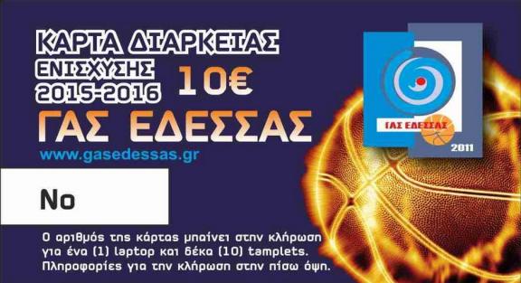 Σε κυκλοφορία βγαίνουν οι κάρτες διαρκείας ενίσχυσης του ΓΑΣ Έδεσσας για την αθλητική χρονιά 2015-16. Η αξία της κάρτα είναι 10 ευρώ.