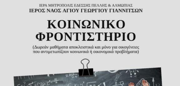 Για 18η συνεχόμενη χρονιά η ενορία Αγίου Γεωργίου Γιαννιτσών διοργανώνει, με την ευλογία της Ιεράς Μητροπόλεως Εδέσσης, Πέλλης και Αλμωπίας, δωρεάν φροντιστηριακά μαθήματα για το σχολικό έτος 2025-2026, τα οποία απευθύνονται σε παιδιά Δημοτικού, Γυμνασίου και Λυκείου και αφορούν αποκλειστικά οικογένειες που αντιμετωπίζουν κοινωνικά ή οικονομικά προβλήματα.