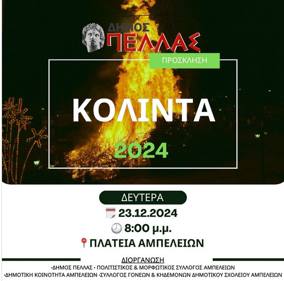 Ο Δήμος Πέλλας σας προσκαλεί τη Δευτέρα 23 Δεκεμβρίου 2024 και ώρα 8:00 μ.μ. στην πλατεία της Δημοτικής Κοινότητας Αμπελειών στα ΚΟΛΙΝΤΑ του Δήμου Πέλλας.