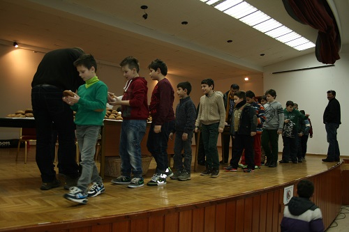 αθλητές και αθλήτριες όλων των τμημάτων καθώς και οι γονείς τους. Το χιόνι που έπεφτε το απόγευμα έδωσε μαγικό τόνο στην εκδήλωση και δημιούργησε εύθυμη διάθεση σε όλους. Ο πάτερ Δίος Νικόλαος για άλλη μία χρονιά καθήλωσε