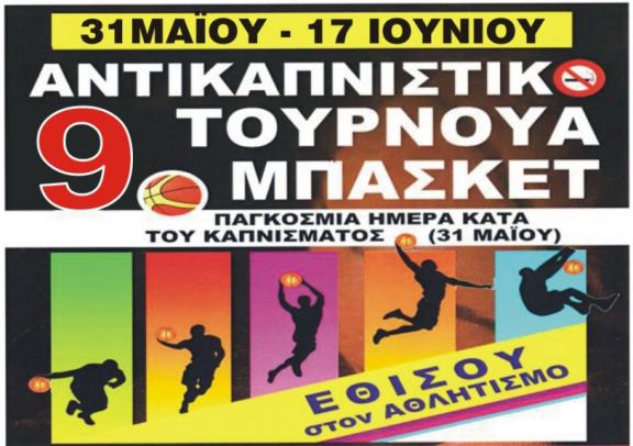 Με αφορμή την Παγκόσμια Ημέρα Κατά του Καπνίσματος (31 Μαΐου) θα πραγματοποιηθεί και φέτος το 9ο Αντικαπνιστικό Τουρνουά Μπάσκετ «Εθίσου στον Αθλητισμό».