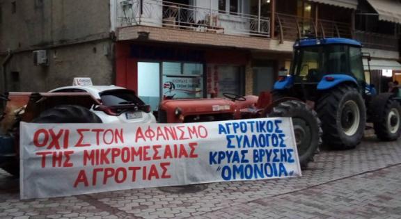 Σε συνέχεια των αγωνιστικών αποφάσεων της πλατιάς σύσκεψης Αγροτικών Συλλόγων της Β. Ελλάδας και της Λάρισας που πραγματοποιήθηκε στις 22 Σεπτέμβρη στην Βέροια, ο Αγροτικός Σύλλογος Κρύας Βρύσης “ΟΜΟΝΟΙΑ”, πραγματοποίησε παράσταση διαμαρτυρίας στην Κεντρική Πλατεία Κρύας Βρύσης με αγροτικά μηχανήματα, το απόγευμα της Τρίτης 11 του Οκτώβρη. Κεντρικό αίτημα η αναπλήρωση του χαμένου εισοδήματος, η μείωση του κόστους παραγωγής (ενέργεια, καύσιμα, αγροεφόδια, ζωοτροφές), να σταματήσει το αίσχος των ανοιχτών τιμών, να κατοχυρωθούν κατώτατες τιμές σε όλα όσα παράγουμε, ώστε να καλύπτεται το κόστος παραγωγής και να μας επιτρέπει να μπορούμε να συνεχίσουμε να καλλιεργούμε, αφήνοντας μας ένα εισόδημα να ζήσουμε τις οικογένειες μας. Να μην υπάρχει αυτή η τεράστια διαφορά στις τιμές από το χωράφι στο ράφι. Επόμενο αγωνιστικό ραντεβού δίνουμε στην πανελλαδική κινητοποίηση αγροτικών συλλόγων στην agrotica το Σάββατο 22 Οκτώβρη.