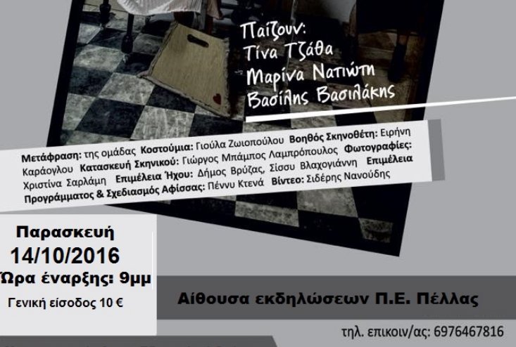 Μία καταπληκτική παραγωγή από την Ομάδα Θεάτρου ΔΕΝ με την υποστήριξη του Εδεσσαϊκού Θεάτρου, θα έχει την ευκαιρία να απολαύσει το θεατρόφιλο κοινό της πόλης μας, την Παρασκευή 14 Οκτώβρη 2016 και ώρα 9 το βράδυ στην αίθουσα εκδηλώσεων της Π.Ε. Πέλλας (πρώην Νομαρχία).