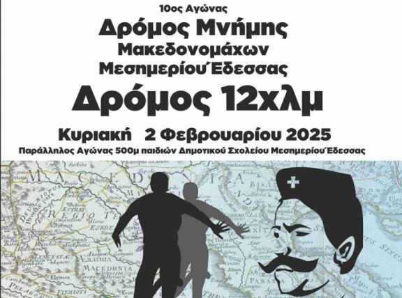 Ο Δήμος Έδεσσας, σε συνεργασία με τοπικούς συλλόγους και φορείς, διοργανώνει τον 10ο Αγώνα Δρόμου Μνήμης Μακεδονομάχων Μεσημερίου Έδεσσας την Κυριακή 2 Φεβρουαρίου 2025. Ο αγώνας τιμά τους γηγενείς Μακεδονομάχους που θυσιάστηκαν στις 2 Φεβρουαρίου 1905.