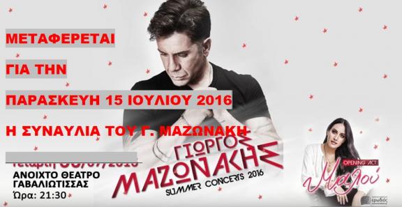 Μεταφέρεται η ημερομηνία της συναυλίας στην Γαβαλιώτισσα του Γ. Μαζωνάκη για την Παρασκευή 15 Ιουλίου και αυτό εξ αιτίας του εκτάκτου δελτίου έντονων καιρικών φαινόμενων με βροχοπτώσεις που εξέδωσε η ΕΜΥ στην περιοχή της Έδεσσας αλλά και σε όλο τον νομό.