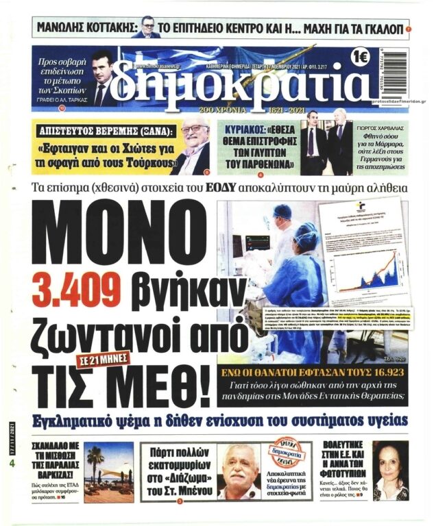 Την “μαύρη αλήθεια” -όπως την χαρακτηρίζει- διαπιστώνει στο σημερινό της πρωτοσέλιδο η εφημερίδα Δημοκρατία αναφέροντας ότι οι θάνατοι έφτασαν τους 16.923, ενώ κάνει λόγο για… “εγκληματικά ψέματα” ως προς την ενίσχυση του συστήματος Υγείας!