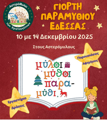 Αγαπητοί συνεργάτες, σας προσκαλούμε στη φετινή γιορτή παραμυθιού "Μύλοι, μύθοι, παραμύθι 2025" που θα πραγματοποιηθεί στους Αστερόμυλους της Έδεσσας από 10 εως 13 Δεκεμβρίου 2025.