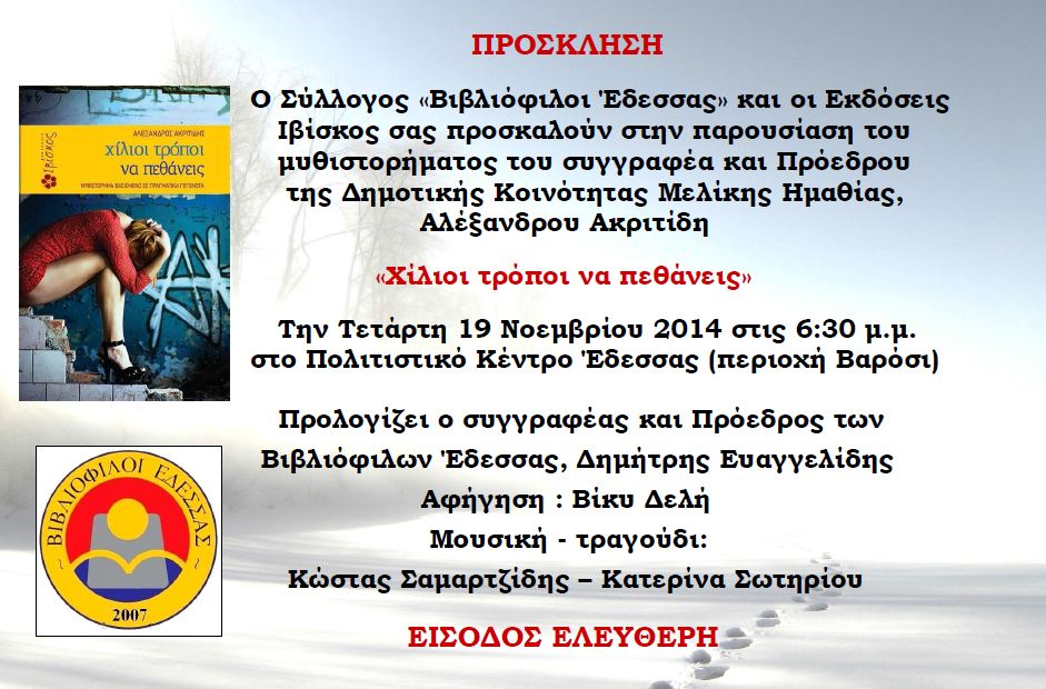 του μυθιστορήματος του συγγραφέα και Πρόεδρου της Δημοτικής Κοινότητας Μελίκης Ημαθίας, Αλέξανδρου Ακριτίδη «Χίλιοι τρόποι να πεθάνεις» Την Τετάρτη 19 Νοεμβρίου 2014 στις 6:30 μ.μ. στο Πολιτιστικό Κέντρο Έδεσσας (περιοχή Βαρόσι) Προλογίζει ο συγγραφέας και Πρόεδρος των Βιβλιόφιλων Έδεσσας, Δημήτρης Ευαγγελίδης Αφήγηση : Βίκυ Δελή Μουσική - τραγούδι: Κώστας Σαμαρτζίδης – Κατερίνα Σωτηρίου ΕΙΣΟΔΟΣ ΕΛΕΥΘΕΡΗ