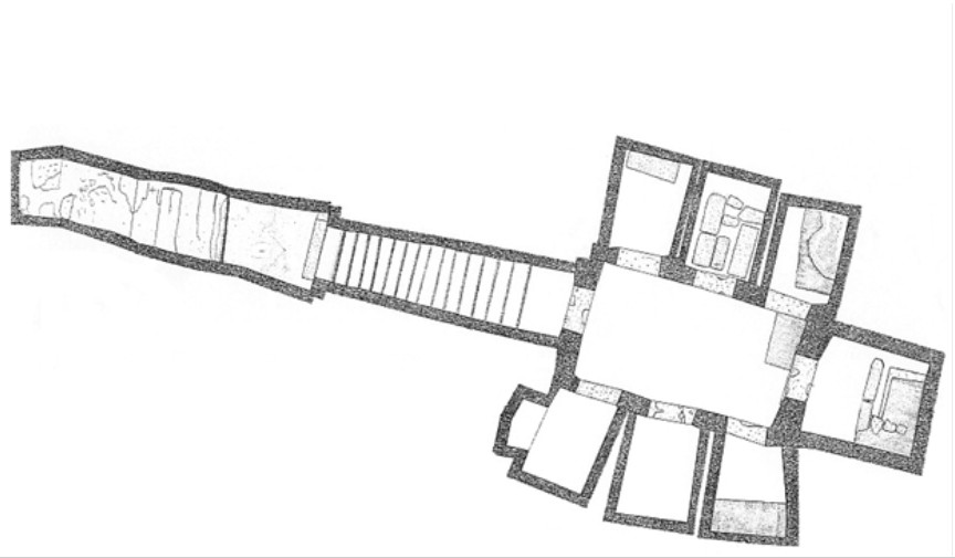 Αποτελείται από μία κεντρική αίθουσα στις 3 πλευρές της οποίας ανοίγονται επτά συνολικά λαξευτοί θάλαμοι με θολωτή οροφή και επιχρισμένους τοίχους. Στην κεντρική αίθουσα οδηγούσε μακρύς υπόγειος διάδρομος, ένα τμήμα του οποίου ήταν κλιμακωτό. Ο διάδρομος διευκόλυνε την ταφή περισσοτέρων ατόμων αυτής της οικογένειας, η οποία έθαπτε εδώ τα μέλη της από το τέλος του 4ου ως τις αρχές του 1ου αιώνα π.Χ. Παρά τη σύληση του μνημείου, ήδη από την αρχαιότητα, δεκάδες πήλινα αγγεία και ειδώλια βρέθηκαν σπασμένα στα δάπεδά του και στα διαλυμένα κτιστά βάθρα πάνω στα οποία πρέπει να τοποθετούνταν νεκρικές κλίνες ή κιβωτίδια. Θραύσματα επίχρυσων στεφανιών, σιδερένια και χάλκινα αντικείμενα μαρτυρούν για τον πλούτο της λείας που αποκόμισαν οι ιερόσυλοι.