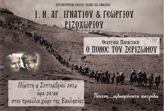 Την Πέμπτη 4 Σεπτεμβρίου 2014, ώρα 20.00, η ενορία Αγίων Ιγνατίου και Γεωργίου Ριζοχωρίου διοργανώνει Θεατρική Παράσταση με θέμα τον αλησμόνητο Πόντο και τίτλο: «Ο ΠΟΝΟΣ ΤΟΥ ΞΕΡΙΖΩΜΟΥ».