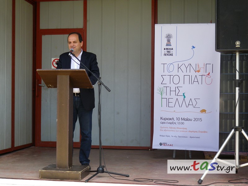 Στη συνέχεια, χαιρέτησε την εκδήλωση ο Δήμαρχος Πέλλας κ. Γρηγόρης Στάμκος. Κατά την ομιλία του προσέγγισε το θέμα της πολιτιστικής ανάπτυξης. Ανέφερε χαρακτηριστικά: «Τιμούμε το κυνήγι, αυτό που έθρεψε το σώμα και τη φαντασία της Πέλλας. Ελκυστικό συμπλήρωμα του κυνηγιού είναι βέβαια οι ιστορίες που κατά καιρούς το συνοδεύουν. Σας ομολογώ ότι δεν γνωρίζω αν υποκρύπτεται αλήθεια για τα ογκώδη θηράματα και τις απίστευτα εύστοχες βολές. Ακόμη και αν είναι αναληθή, είναι σίγουρα απολαυστικά. Αυτή λοιπόν, είναι η σημερινή εκδήλωση, η απόδοση τιμής στο πιάτο της Πέλλας. Αν δεν επιστρέψει η παραδοσιακή γαστρονομία στο καθημερινό πιάτο, δεν θα μπορέσουμε να την προτείνουμε ως τουριστικό προϊόν στον επισκέπτη. Η ανάπτυξη του πολιτισμού, η ανάπτυξη του τουρισμού δεν περνά μόνο από καινοτόμες δράσεις. Προϋπόθεση τους είναι εμείς οι ίδιοι, οι άνθρωποι της Πέλλας να επανασυνδεθούμε με τον τόπο, να ενθυμηθούμε το ωραίο παρελθόν, να αγαπήσουμε εξ αρχής την Πέλλα».