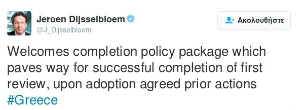 19:47: Ο πρόεδρος του Eurogroup Γερούν Ντάισελμπλουμ είπε ότι ανοίγει ο δρόμος για ολοκλήρωση της αναθεώρησης. «Χαιρετίζω τη δέσμη μέτρων πολιτικής ολοκλήρωσης, που ανοίγει το δρόμο για την επιτυχή ολοκλήρωση της πρώτης αναθεώρησης, μετά την συμφωνία υιοθέτησης προληπτικών μέτρων» έγραψε στo twitter.