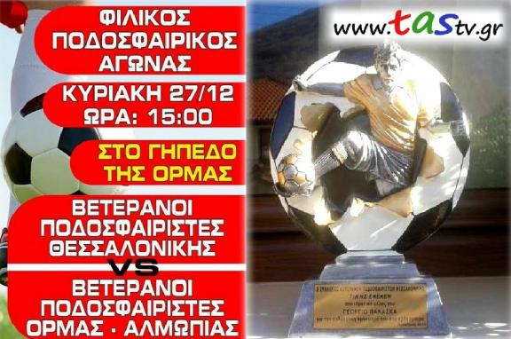 Ποδοσφαιρικός φιλικός αγώνας θα διεξαχθεί αύριο 27 Δεκεμβρίου 2015 στις 3 το μεσημέρι στο γήπεδο της Όρμας - Ακμωπίας μεταξύ των Βετεράνων Ποδοσφαιριστών της Όρμας και της Θεσσαλονίκης. Ένας ενδιαφέρον αγώνας όπου
