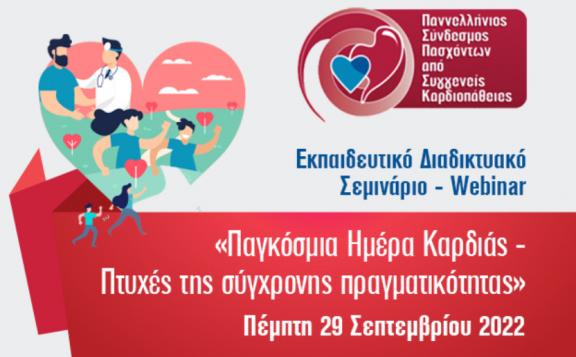 Ο Πανελλήνιος Σύνδεσμος Πασχόντων από Συγγενείς Καρδιοπάθειες με αφορμή την Παγκόσμια Ημέρα Καρδιάς διοργανώνει την Πέμπτη 29 Σεπτεμβρίου 2022, και ώρα 18.30-20.30, εκπαιδευτικό διαδικτυακό σεμινάριο με τη συμμετοχή καταξιωμένων επιστημόνων του κλάδου της καρδιολογίας οι οποίοι θα παρουσιάσουν πολύ ενδιαφέροντα στοιχεία προσεγγίζοντας ένα ευρύ φάσμα των παθήσεων της καρδιάς.