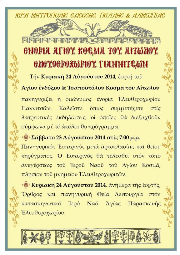 Την Κυριακή 24 Αυγούστου 2014, εορτή του Αγίου Ενδόξου και Ισαποστόλου Κοσμά του Αιτωλού πανηγυρίζει η ομώνυμη ενορία Ελευθεροχωρίου Γιαννιτσών σύμφωνα με το παρακάτω πρόγραμμα: