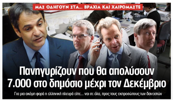 Σύμφωνα με τις πληροφορίες που προκύπτουν από το αποτέλεσμα της συνάντησης των δύο πλευρών, ο στόχος των 7.000 απολύσεων που έχει τεθεί για το 2014 θα υλοποιηθεί, αφού ο κ. Μητσοτάκης είναι αποφασισμένος να στείλει εκτός εργασίας 7.000 εργαζομένους και στην απόγνωση της οικογένειές τους.