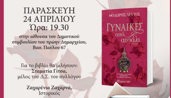 Με χαρά σας προσκαλούμε στην εκδήλωση παρουσίασης βιβλίου του συγγραφέα Θοδωρή Δεύτου με τίτλο «ΓΥΝΑΙΚΕΣ ΑΠΟ ΑΤΣΑΛΙ» που συνδιοργανώνουν ο Σύλλογος Ηπειρωτών Κρύας Βρύσης ¨Ο ΠΥΡΡΟΣ¨ και οι Εκδόσεις «ΧΑΡΤΙΝΗ ΠΟΛΗ».