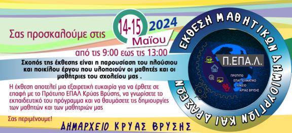 Εκθεση Μαθητικών Δημιουργιών & Δράσεων του ΠΡΟΤΥΠΟΥ ΕΠΑΛ ΚΡΥΑΣ ΒΡΥΣΗΣ , την Τρίτη 14 & Τετάρτη 15 Μαίου 2024 , που θα πραγματοποιηθεί στον χώρο του πρώην Δημαρχείου της Κρύας Βρύσης. Ωρες Λειτουργίας της Εκθεσης 09:00 έως 13:00