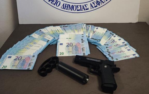 Κατασχέθηκαν 723 πλαστά χαρτονομίσματα, αξίας των 20 ευρώ, ένα πιστόλι «ρέπλικα» με σιγαστήρα και μία σιδερογροθιά