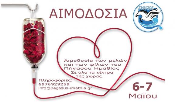 Το Σαββατοκύριακο 7-8 Μαΐου 2017, ο Πήγασος Ημαθίας διοργανώνει την 6η Αιμοδοσία για την τράπεζα αίματος του συλλόγου.