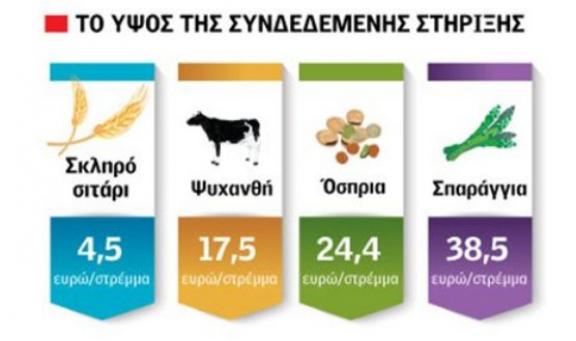 Υπενθυμίζεται ότι έχουν ήδη αναρτηθεί στη Διαύγεια οι πρώτες 4 αποφάσεις με τα ποσά που προσδιορίζουν το ύψος των συνδεδεμένων στο σκληρό σιτάρι στα 4,5 ευρώ το στρέμμα, τα όσπρια στα 24,4 ευρώ το στρέμμα, τα κτηνοτροφικά ψυχανθή στα 17,5 ευρώ και τα σπαράγγια στα 38,5 ευρώ το στρέμμα. Σύμφωνα με τις αποφάσεις, και στις 4 περιπτώσεις, το ύψος της ενίσχυσης αντιστοιχεί στα ενδεικτικά ποσά (υπολογίζεται ως ο λόγος του προϋπολογισμού για το έτος 2015 προς την έκταση αναφοράς), όπως είχαν εξ αρχής ανακοινωθεί, παρά το γεγονός ότι οι επιλέξιμες εκτάσεις υπολείπονται των εκτάσεων αναφοράς.