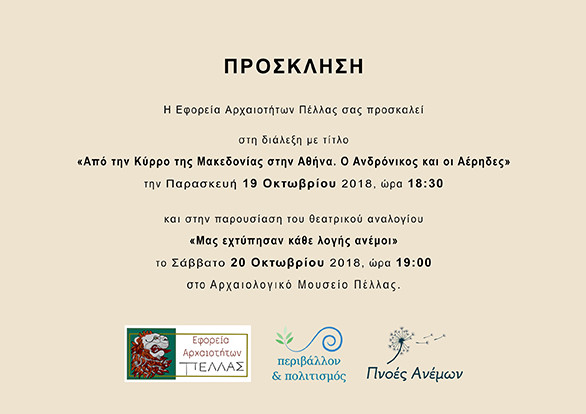 Στο πλαίσιο της επικοινωνιακής δράσης πανελλήνιας εμβέλειας με τίτλο «Περιβάλλον και Πολιτισμός», αφιερωμένη κατά τη διετία 2017-2018 στις «Πνοές Ανέμων», στόχος της οποίας είναι η ανάδειξη του φυσικού και πολιτιστικού πλούτου της χώρας και η ευαισθητοποίηση των πολιτών για την προστασία του, η Εφορεία Αρχαιοτήτων Πέλλας θα πραγματοποιήσει τις ακόλουθες δράσεις για μαθητές και ενήλικες: