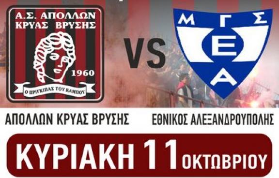 Αγαπητή μας φίλοι του τοπικού Ποδοσφαίρου. Ο Απόλλωνας δίνει αύριο ένα καθοριστικό παιχνίδι μέσα στην Κρύα Βρύση, με αντίπαλο τον ΕΘΝΙΚΟ ΑΛΕΞΑΝΔΡΟΥΠΟΛΗΣ στις 4:00 μ. μ. Το Δ.Σ. της ομάδας μας καλεί όλους τους φίλαθλους Πέλλας, Ημαθίας και όχι μόνο, να δώσουν το παρόν τους στον αγώνα, βοηθώντας την ομάδα μας να φτάσει στην κατάκτηση της νίκης.